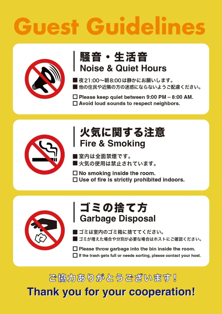 • ゲストガイドライン(騒音・ゴミ・火災予防)