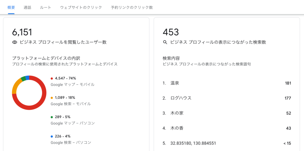 当社の熊本施設は少しわかりづらいところにあるため、当初3)の目的で登録しました(予約時に住所に加えてマップのリンクを送っている)が、後々になって当施設を見つけて予約するきっかけとしてGooglemapが機能していることに気づきました。