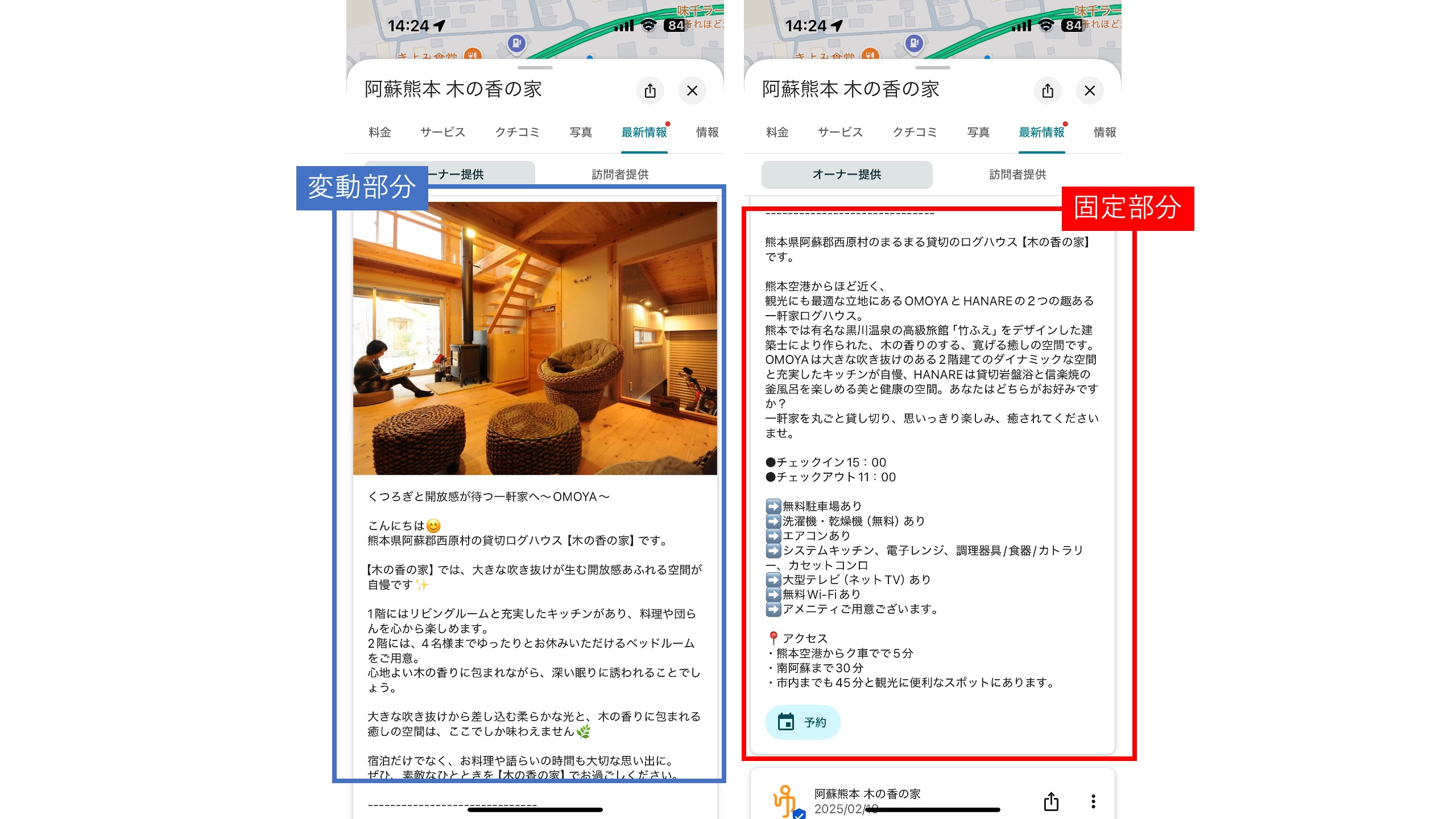 3)週1回以上(できれば2回)最新情報を投稿する大してネタがなくても、とにかく定期的に最新情報をアップし、更新されている状態を作ることが重要です。その際に、毎回変わる【投稿文章】(変動部分)+変わらない【基本文章】(固定部分)の組み合わせにすることが重要です。