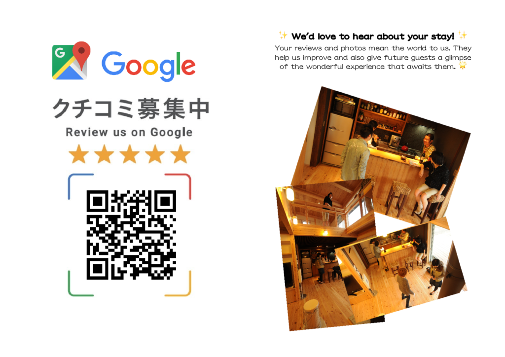 オーナーからの情報だけでなく、泊まっていただいたゲストから投稿いただくことは非常に有効です。OTAの口コミと合わせ、googlemapの口コミを書いていただくためのQRコードを室内に掲示すると良いでしょう。